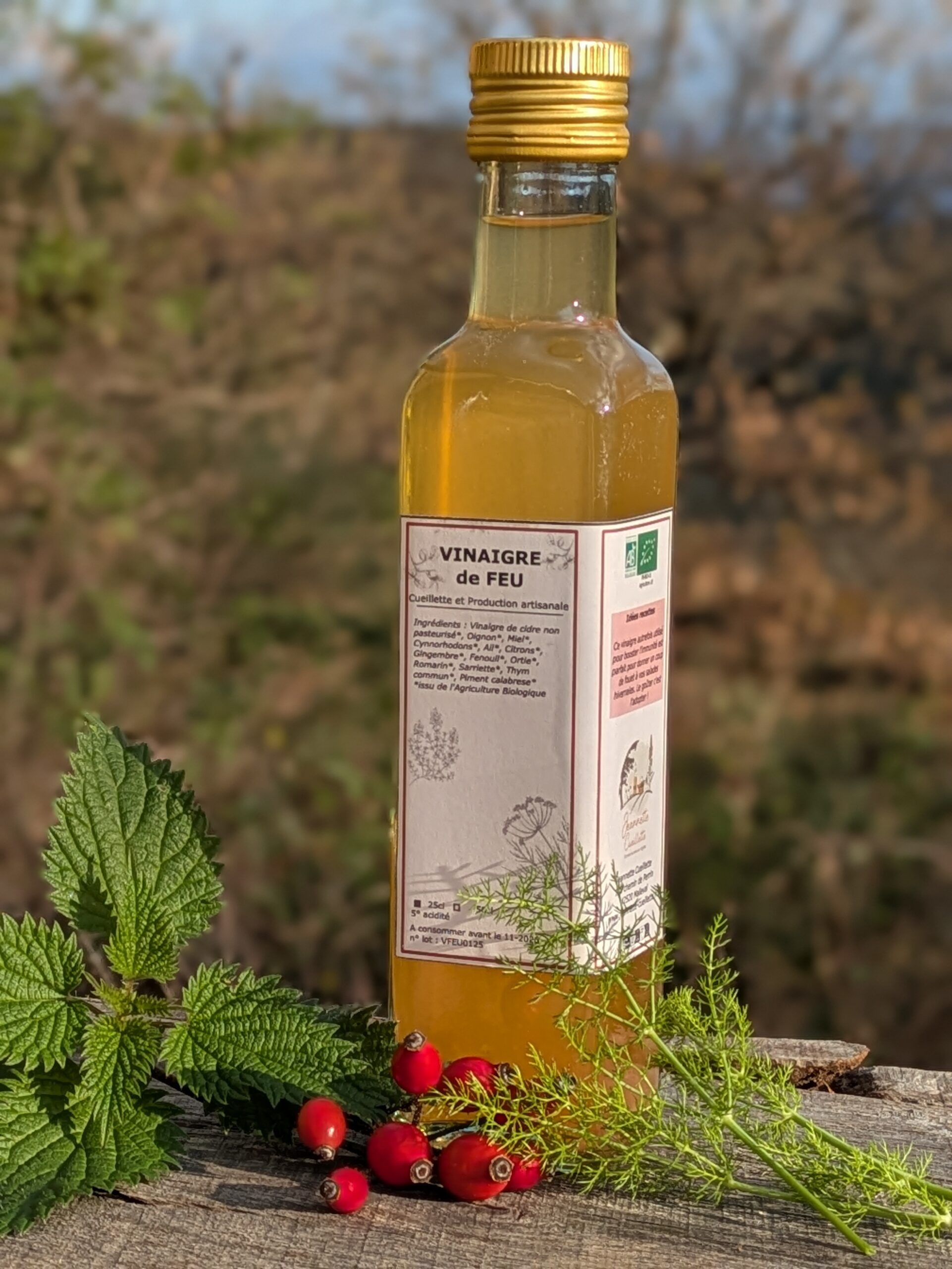 Ingrédients : Vinaigre de cidre non pasteurisé*, Oignon*, Miel*, Cynnorhodons*, Ail*, Citrons*, Gingembre*, Fenouil*, Ortie*, Romarin*, Sarriette*, Thym commun*, Piment calabrese*